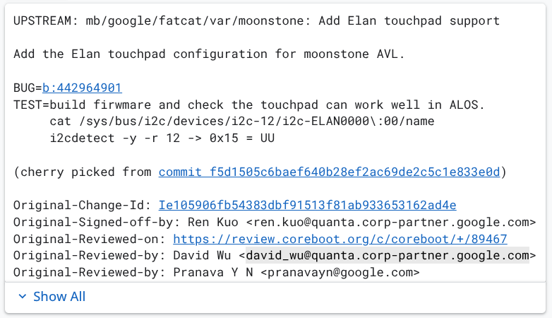 So, how do we know this is an Acer device? The commit was handled by developer David Wu that we see all over Acer Chromebooks in the Chromium Gerrit. His email address has ties to Quanta as well, and we know through the years that ODM tends to point to Acer. Combine that with his history of work on Acer devices and the deduction is pretty easy to see.