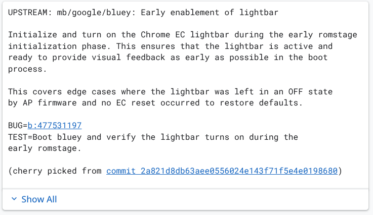 The commit focuses on the “early enablement” of the lightbar, ensuring it fires up during the very first stages of the boot process to provide “visual feedback as early as possible.” Seeing this level of attention to detail for the boot sequence on ‘Bluey’ confirms what we already suspected: these devices are being designated as flagship torchbearers for the next era of ChromeOS and Project Aluminium.