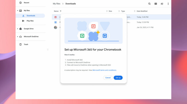 Users will be offered a guided setup experience that takes them through the process of installing the Microsoft 365 web app and connecting Microsoft OneDrive to their Chromebook Files app. Files will be moved to Microsoft OneDrive when opening in the Microsoft 365 app.