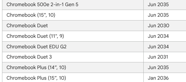 However, the 2034 date doesn’t line up with the latest hardware that was just released at CES 2026. On Google’s own support page that lists all device AUEs, we can clearly see devices that are supported will into 2035 at this point. While there’s a chance that we don’t get any new standard Chromebooks after this latest batch, I’m not convinced that will actually be the case.