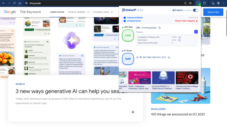 Malicious scams such as phishing, malware, and ransomware continue to evolve and have become a critical concern to users around the globe. To address this issue, Criminal IP, an OSINT-based search engine, made an exciting announcement introducing the launch of a Chrome extension called Criminal IP AI-based Phishing Link Checker on May 22, 2023. This Criminal IP’s Chrome extension offers real-time scanning of websites worldwide, using AI-based detection to identify recently created phishing sites.