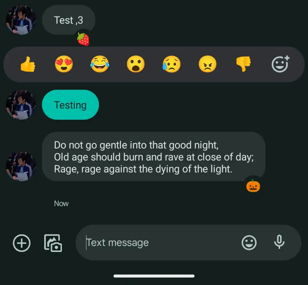 Per 9to5Google, pressing and holding any message in a conversation will call up the entire emoji library, letting you freely browse and choose the one that best suits how you feel about a given chat. Because of the aforementioned RCS feud going on between Apple and Google, these reactions will still appear on iPhones as a quoted message (see below).