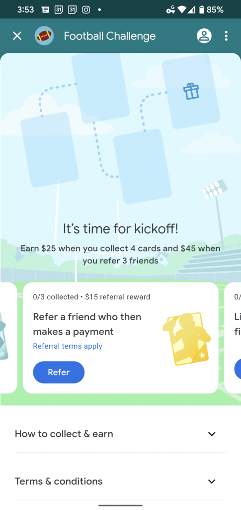 During the Superbowl, Google ran a promotion where you could get up to an extra $55 for referring friends. Then, it had a Spring Challenge where you could earn up to $30 in rewards for collecting and sharing stickers of Spring animals. Now, it’s kicking off a new ‘Football Challenge’ where you can score some extra money by tackling a few tasks, including onboarding your friends to the service.