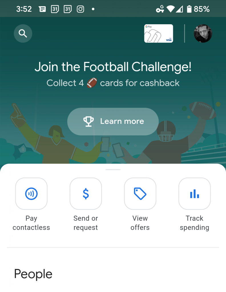 I opened my Pay app earlier today to grab a coffee and a sandwich at Panera Bread, and I noticed the challenge. Right on the home screen, there’s a promotional banner that advertises the new challenge. It says “Join the Football Challenge!” You’ll have to collect four football cards in order to get up to $25 cashback. There’s a daily football quiz where you can answer one question in under a minute to earn a card. You can also earn cards by making two contactless payments, linking a new account for financial insights (via Plaid), and more.