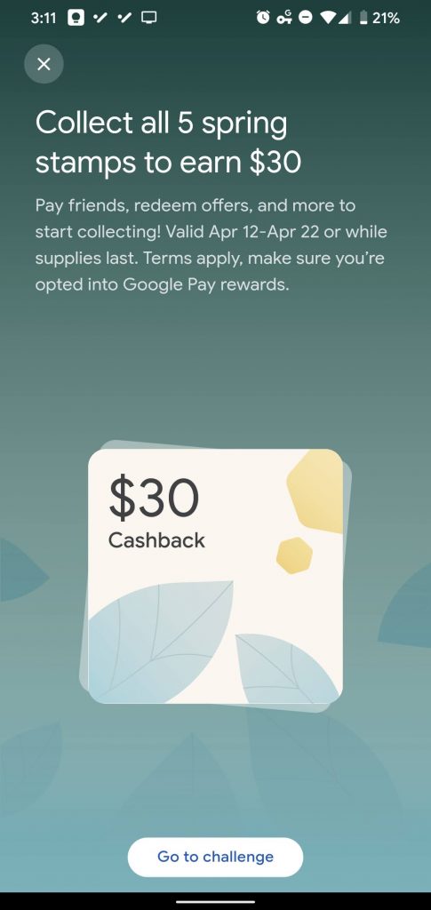You can also get a stamp for redeeming cashback offers at two participating merchants – found on the Explore tab – and several of the listed merchants have online retail options that collaborate with Google Pay. While many of these will make you spend a $35 minimum in order to get your stamp (aha! There’s the catch, Google!) this Spring Challenge can be seen as a way to find something you’re interested in, shop for it via the app, and then get your $30 reward.
