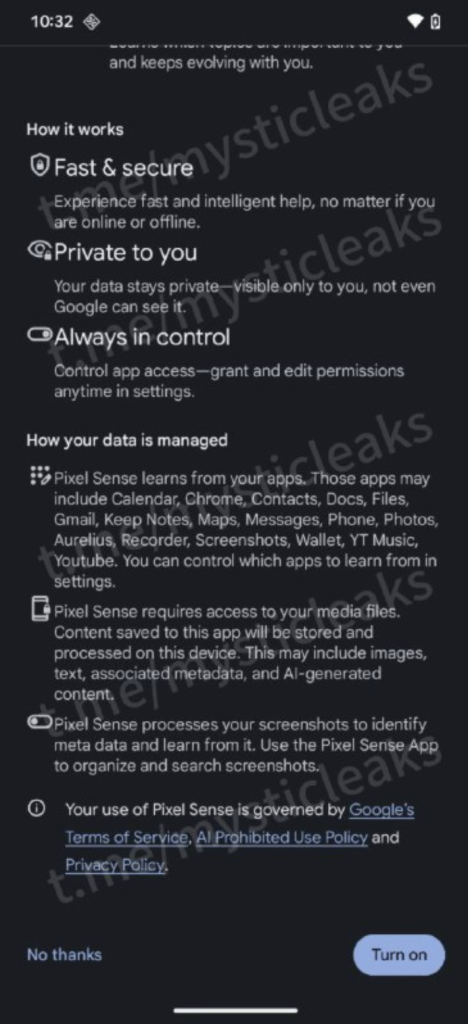 In addition to those claims from Android Authority, we also now have leaked screenshots of the Pixel Sense setup page spotted by 9to5Google in a “Mystic Leaks” Telegram group that offer a preview of its capabilities. The feature promises to deliver “the most personalized experience based on the things you do on your Pixel.”