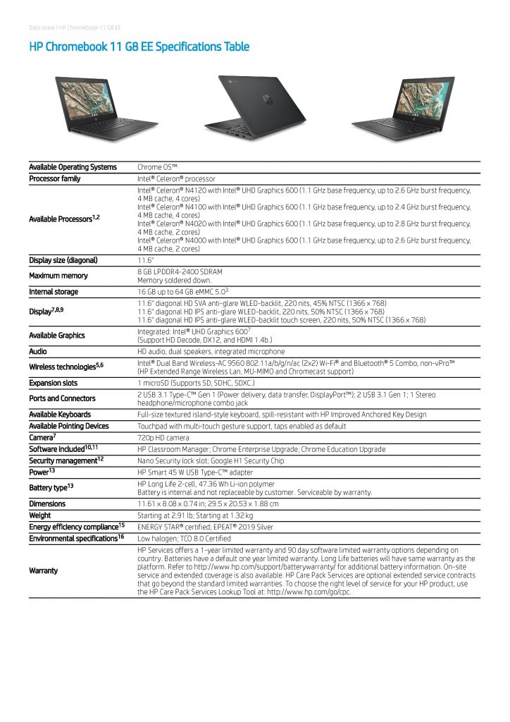 The only convertible of the bunch, the HP Chromebook x360 11 G3 EE looks to be the common fare for the education market but is boasting that it’s the thinnest 11.6″ EDU Chromebooks on the market. With an 11.6″ HD Gorilla Glass display and an optional digitizer with HP EMR Pen, the x360 11 G3 EE looks like just about every other chunky-bezel EDU device on the market. It offers the same variety of Gemini Lake and Gemini Lake-R processors as the Chromebook 11 G8 and can be equipped with up to 8GB of RAM and 64GB of eMMC storage. It is worth mentioning that the HP x360 isn’t being advertised as having USI stylus support which I feel is a massive omission on HP’s part. Their latest x360 models for consumers feature this tech and it seems like a bit of a fail to not include it in an EDU device.