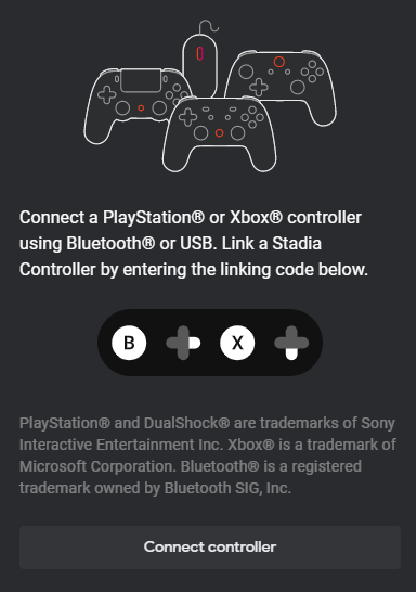Connect a Playstation or Xbox controller using Bluetooth or USB. Link a Stadia controller by entering the linking code below.