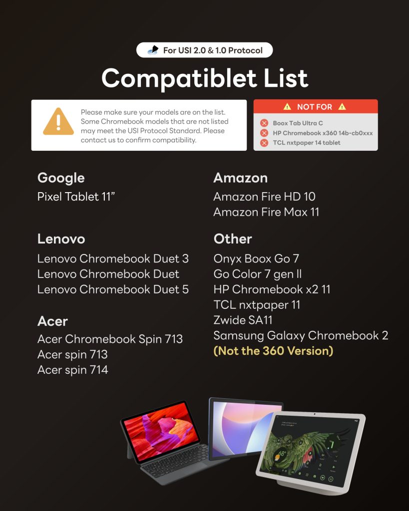True to the core promise of the USI standard, this stylus requires no Bluetooth pairing. Simply press the power button, and it’s ready to write on any compatible USI 2.0 Chromebook or tablet.