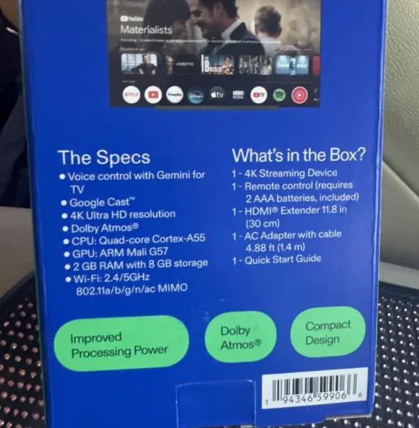 Inside the box, Walmart is including the voice remote (with batteries), a 4.88 ft wall AC adapter, and an HDMI extender to help it fit behind tight wall-mounted TVs. The front of the box also says “Google TV with Gemini,” and under the specs on the back, it explicitly lists “Voice control with Gemini for TV.”