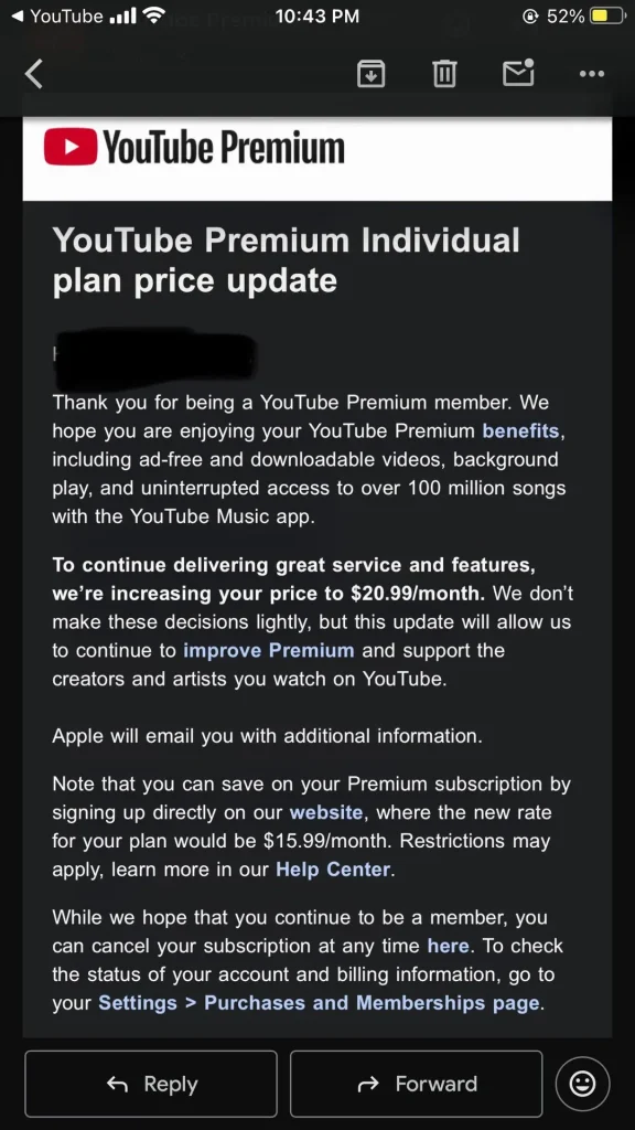 If you currently subscribe to YouTube Premium through Apple’s App Store, you are going to see an even higher rate. Because of the built-in App Store fee, the Individual plan comes out to $20.99 a month. In their notification email, YouTube is actually advising those users to cancel their iOS subscription and sign up directly on the website to secure the standard $15.99 rate.